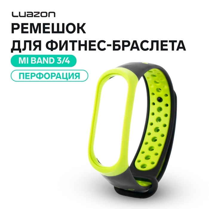 (1021888) Ремешок для фитнес-браслета Mi Band 3/4 LuazON, с перфорацией, черно-зеленый 4780574 купить в Балашихе.